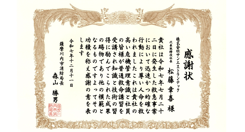今年10月の(株)サンエストランテック社員の人命救助行動について、薩摩川内市消防局様より弊社ならびに弊社社員が感謝状をいただきました。