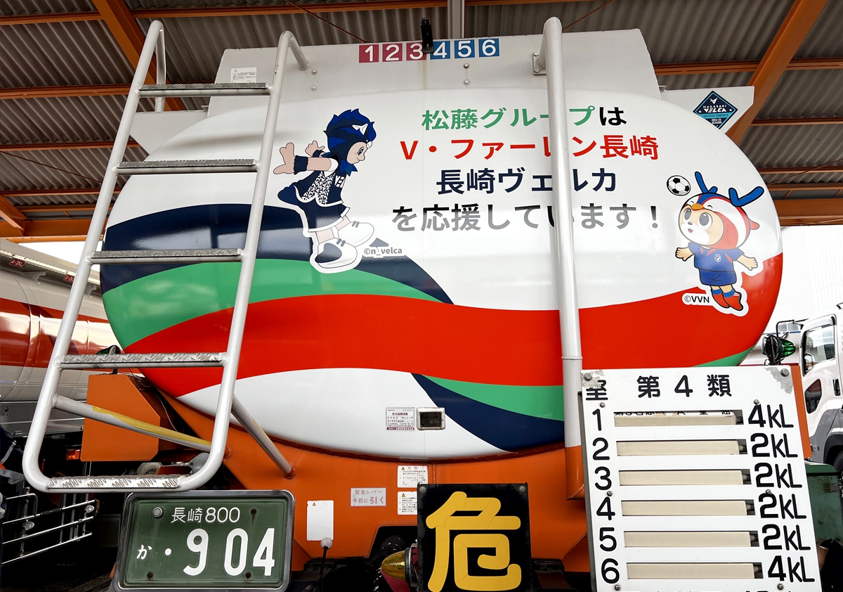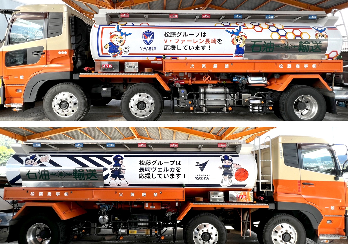 松藤グループでは、Ⅴ・ファーレン長崎様ならびに長崎ヴェルカ様のご協力のもと、それぞれのクラブマスコットである「ヴィヴィくん」と「LUCA」をデザインしたラッピングタンクローリーの運行を開始しました。